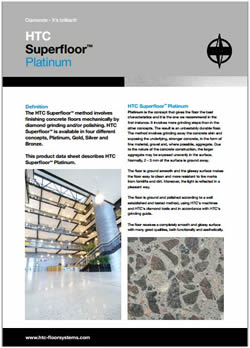 HTC Superfloor™ is a complete concept for polishing concrete. The polishing method mechanically refines the concrete surface by removing the top cement paste and exposing the underlying, stronger concrete. The existing concrete is grinded and polished according to a dependable and thoroughly tested method with HTC’s effective concrete polishing equipment and diamond tools. The result when polishing concrete is a floor with a completely even polished surface of a high quality, both functionally and esthetically.